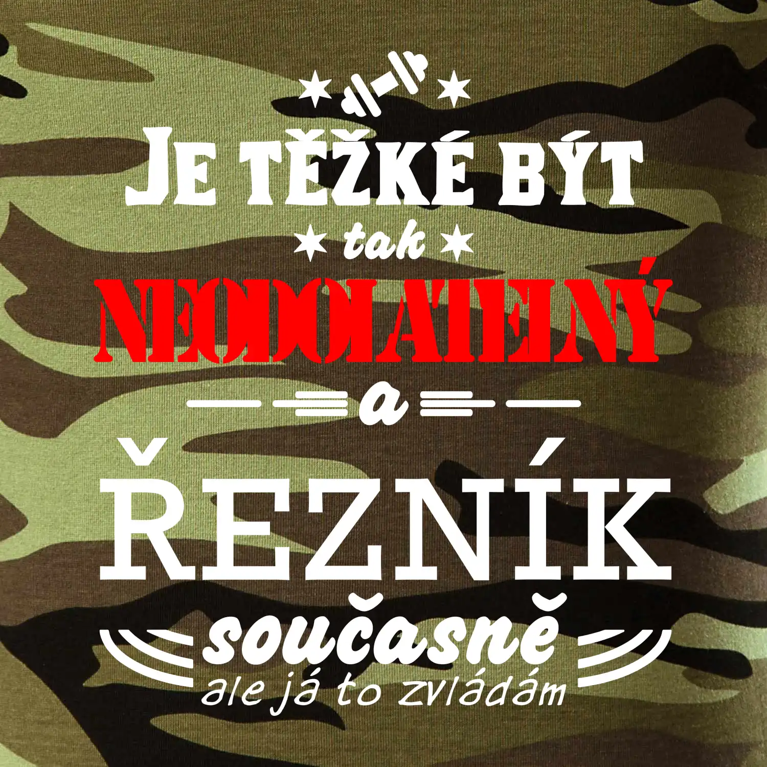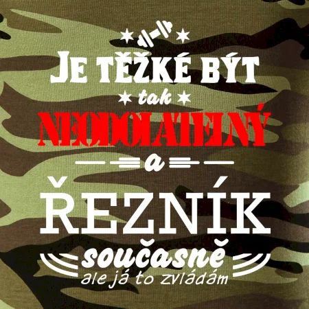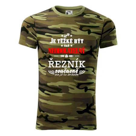 Tričko střední gramáže v barvách camouflage. Střih s bočními švy. Lem průkrčníku ze žebrového úpletu s přídavkem 5 % elastanu. Vnitřní část zadního průkrčníku začištěna páskou v barvě camouflage.