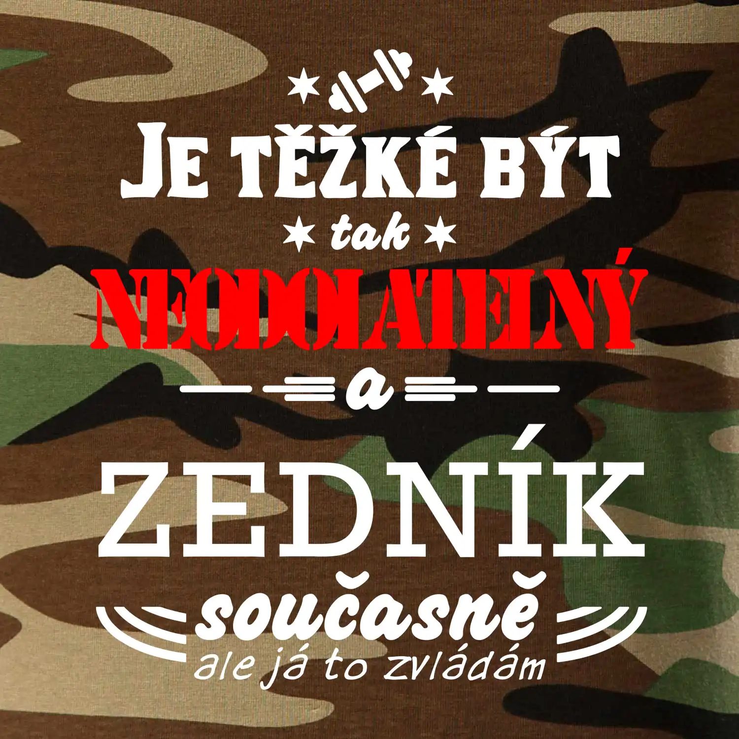 Tričko střední gramáže v barvách camouflage. Střih s bočními švy. Lem průkrčníku ze žebrového úpletu s přídavkem 5 % elastanu. Vnitřní část zadního průkrčníku začištěna páskou v barvě camouflage.