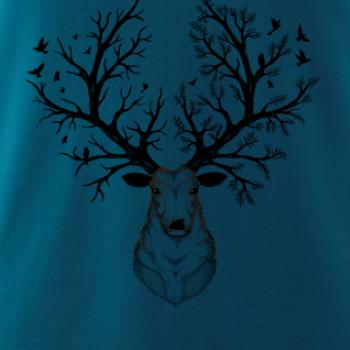 Triko s jelenem je vhodné pro všechny milovníky zvířat a přírody. Hlavní motiv je zvíře - hlava jelena s parohy, které jsou vyobrazené jako strom. Triko, na kterém je jelen je vhodný dárek pro milovníka přírody. Paroží jelena je rozrostlé jako strom.