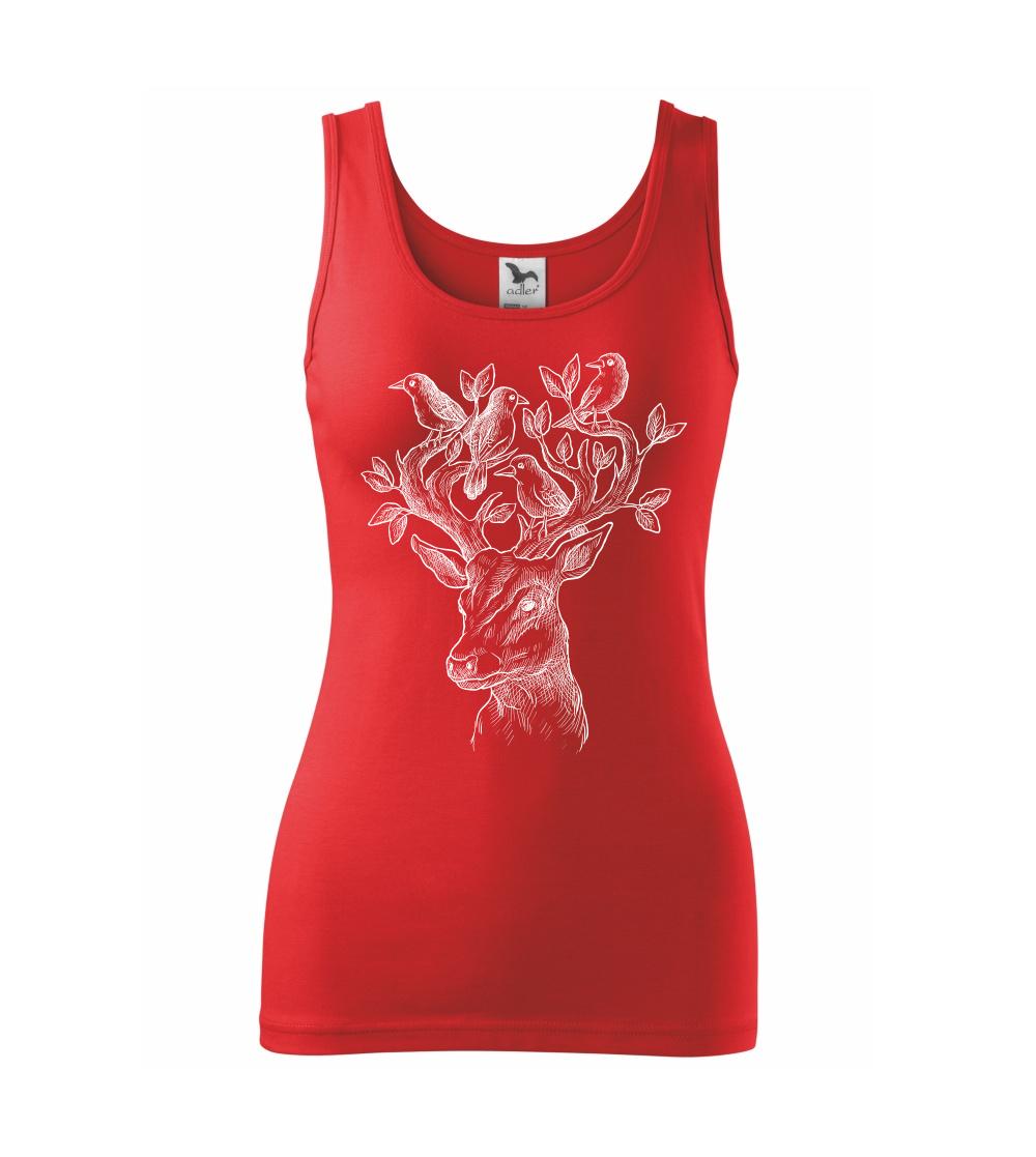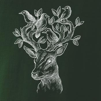 Triko s jelenem, který má v paroží celý svět. Jelen na triku je vhodný dárek pro milovníka přírody. Jelenovy parohy zdobí nějaký ten ptáček. A kdo by nechtěl mít na triku takové pěkné zvíře?