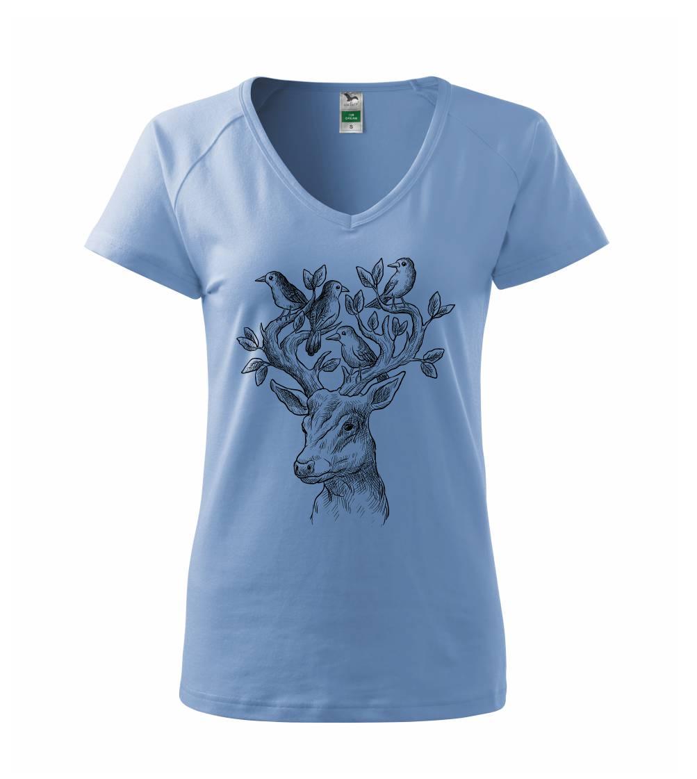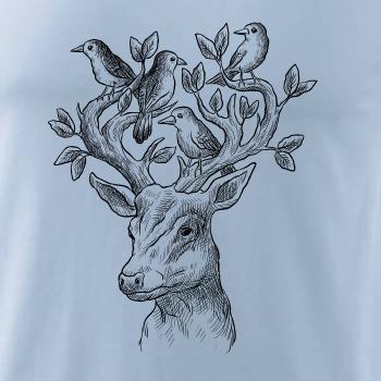 Triko s jelenem, který má v paroží celý svět. Jelen na triku je vhodný dárek pro milovníka přírody. Jelenovy parohy zdobí nějaký ten ptáček. A kdo by nechtěl mít na triku takové pěkné zvíře?