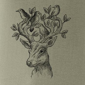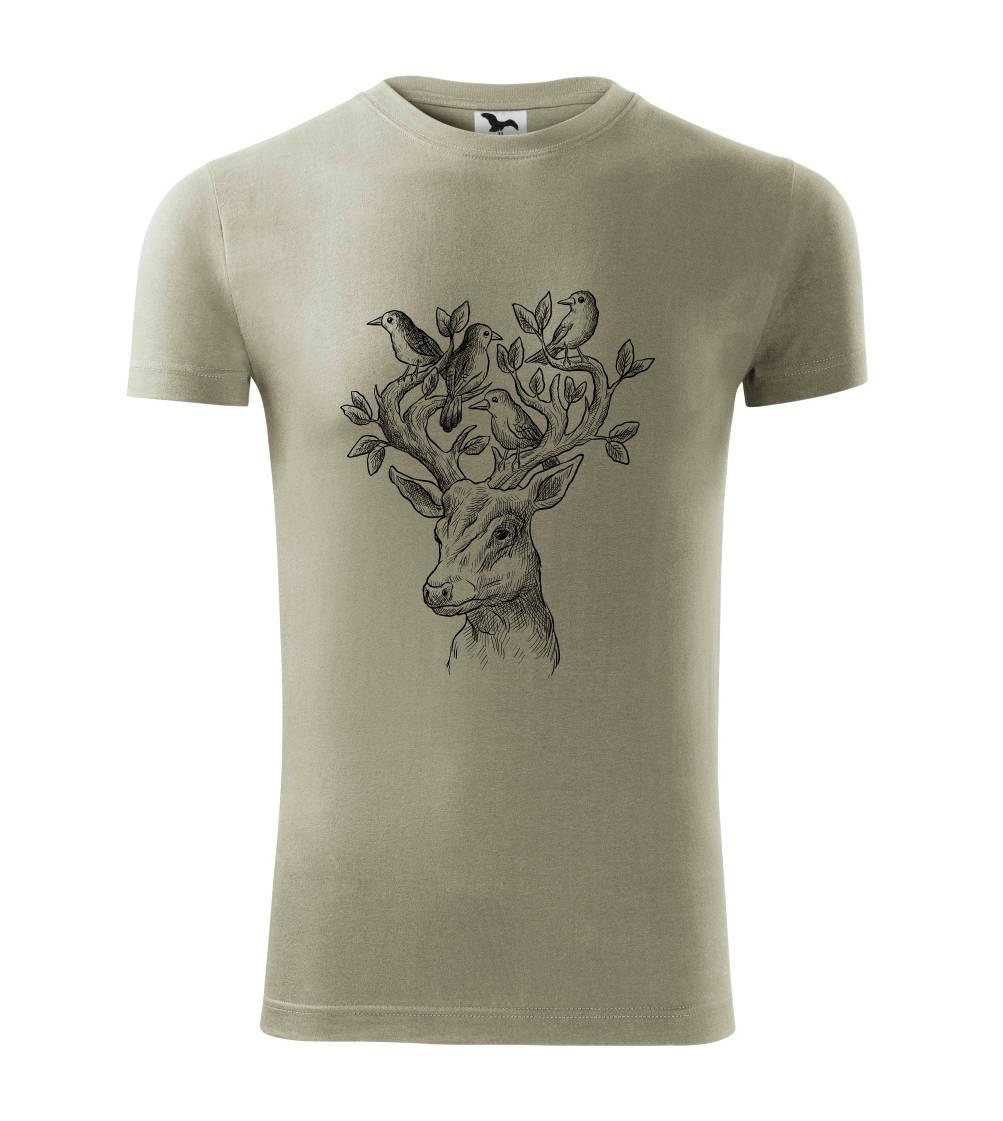 Triko s jelenem, který má v paroží celý svět. Jelen na triku je vhodný dárek pro milovníka přírody. Jelenovy parohy zdobí nějaký ten ptáček. A kdo by nechtěl mít na triku takové pěkné zvíře?