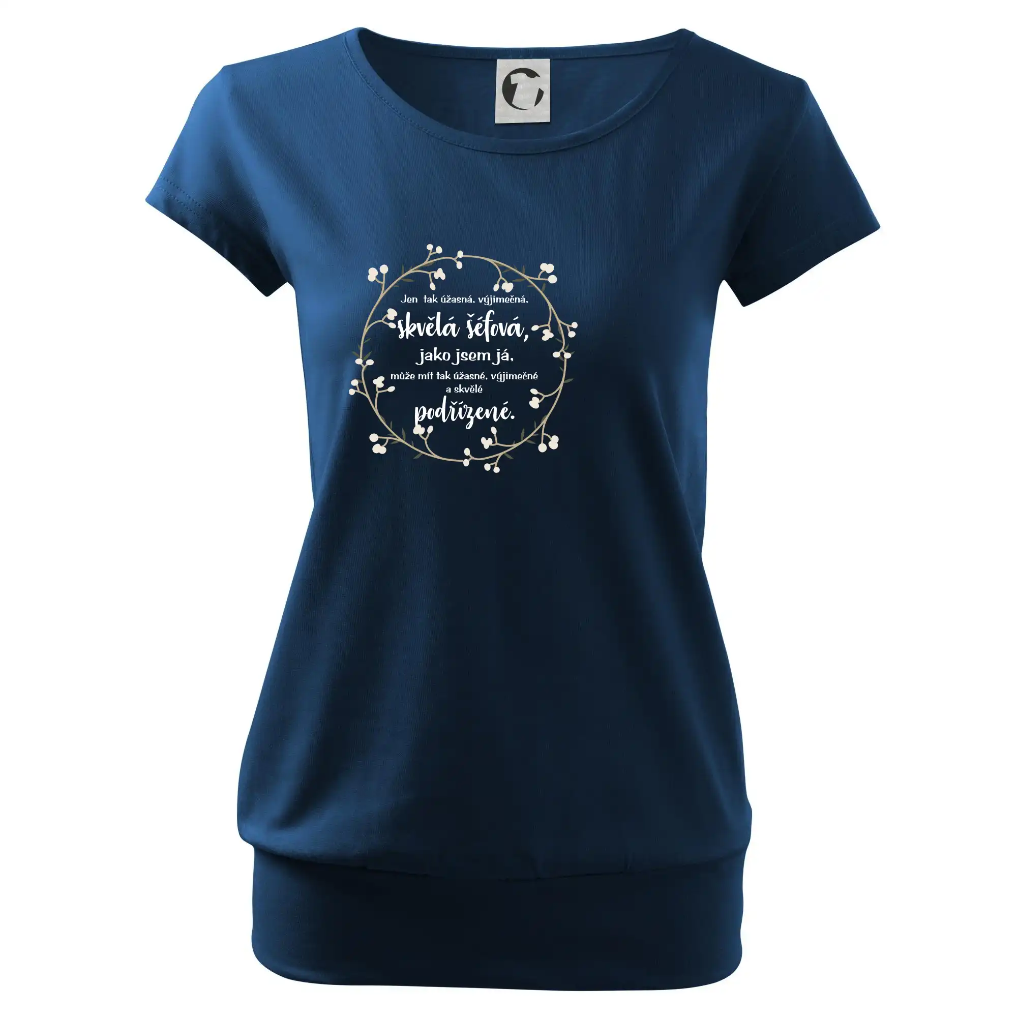 Trendové dámské triko s velmi krátkým rukávem, volnějšího střihu, v dolním kraji všité do širokého lemu. Kulatý průkrčník s úzkým lemem ze shodného materiálu.