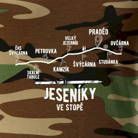 Tričko střední gramáže v barvách camouflage. Střih s bočními švy. Lem průkrčníku ze žebrového úpletu s přídavkem 5 % elastanu. Vnitřní část zadního průkrčníku začištěna páskou v barvě camouflage.