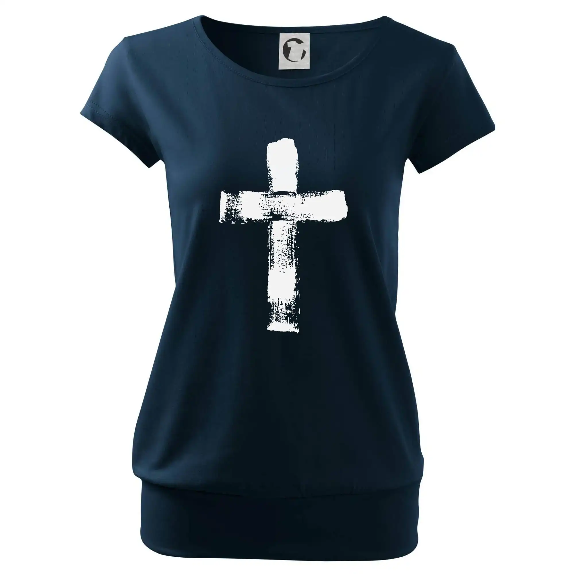 Trendové dámské triko s velmi krátkým rukávem, volnějšího střihu, v dolním kraji všité do širokého lemu. Kulatý průkrčník s úzkým lemem ze shodného materiálu.