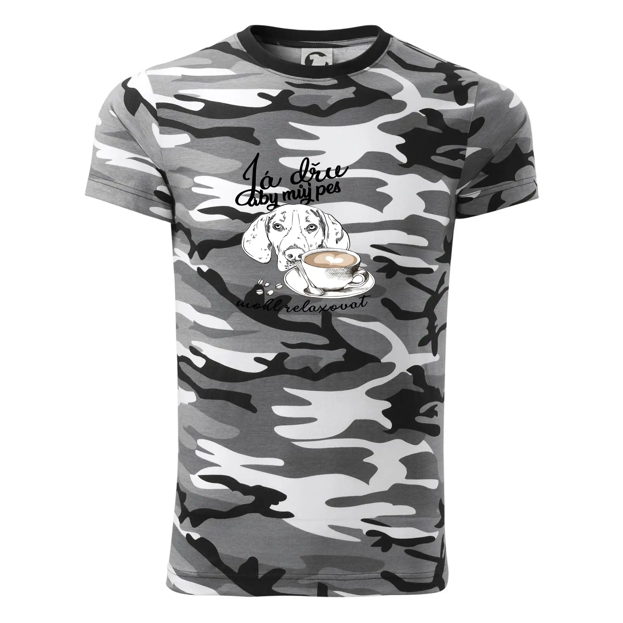 Tričko střední gramáže v barvách camouflage. Střih s bočními švy. Lem průkrčníku ze žebrového úpletu s přídavkem 5 % elastanu. Vnitřní část zadního průkrčníku začištěna páskou v barvě camouflage.