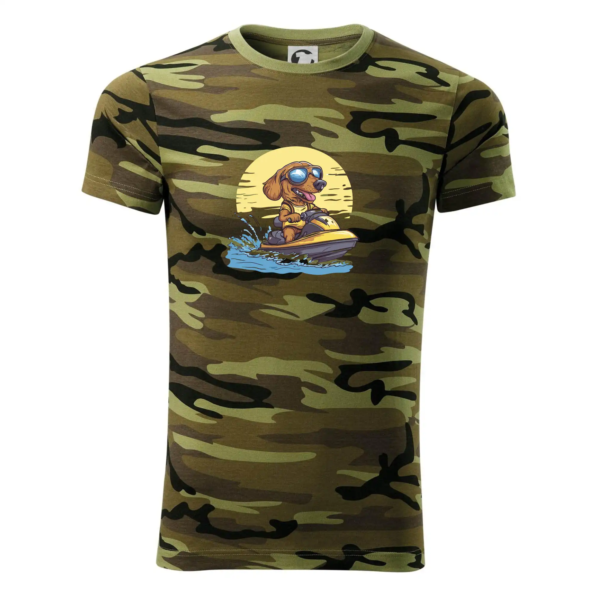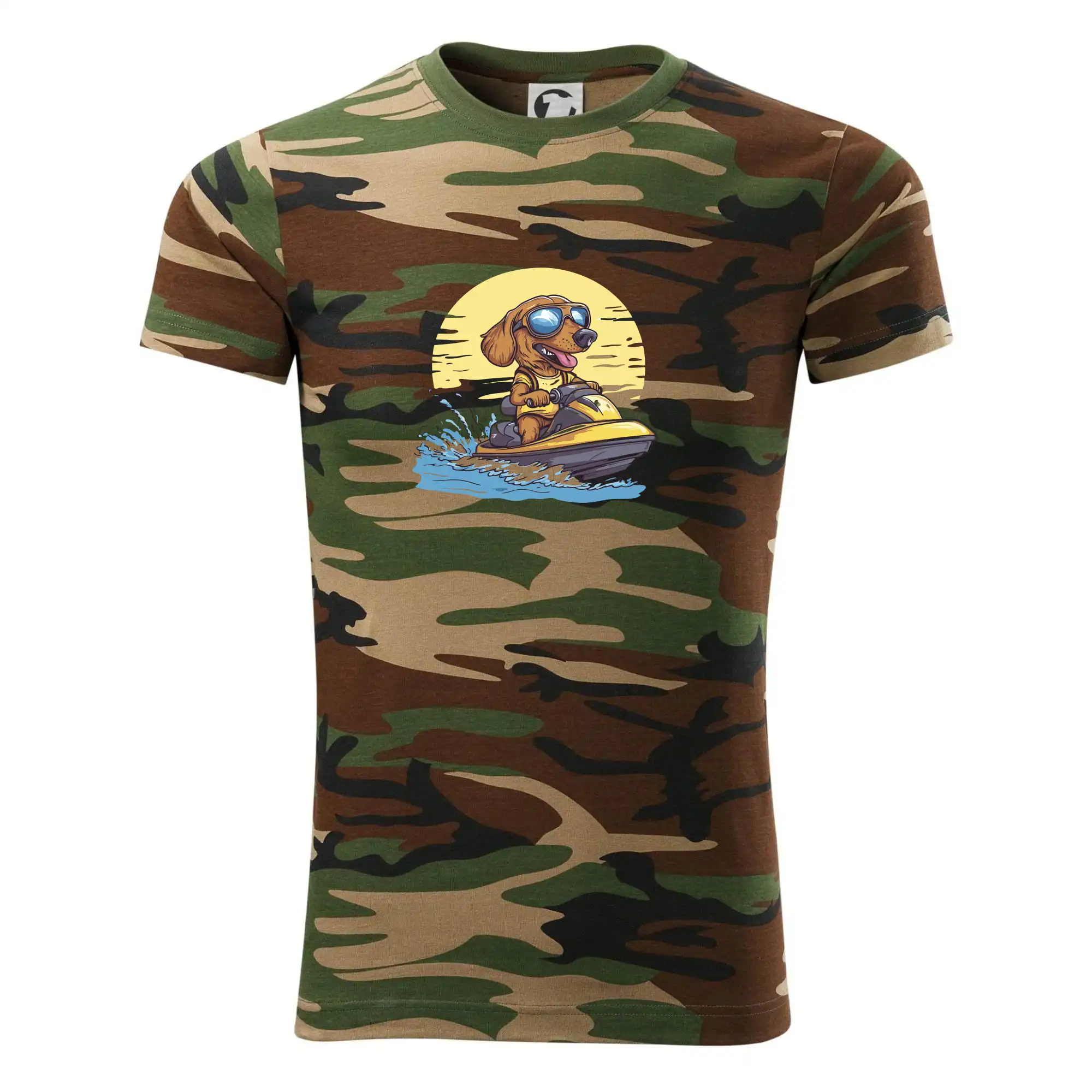 Tričko střední gramáže v barvách camouflage. Střih s bočními švy. Lem průkrčníku ze žebrového úpletu s přídavkem 5 % elastanu. Vnitřní část zadního průkrčníku začištěna páskou v barvě camouflage.