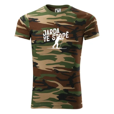 Tričko střední gramáže v barvách camouflage. Střih s bočními švy. Lem průkrčníku ze žebrového úpletu s přídavkem 5 % elastanu. Vnitřní část zadního průkrčníku začištěna páskou v barvě camouflage.