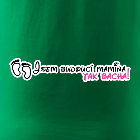 Vtipné triko pro holku s nápisem "Jsem budoucí mamina, tak bacha!" Pokud i ty jsi v jináči, tohle veselé triko je pro tebe jako dělané. Triko s vtipným nápisem jako dárek pro maminku v očekávání. Trička pro všechny těhotné. Pořiď své kamarádce v jináči vtipný dárek! Vtipné triko s nápisem "Jsem budoucí mamina, tak bacha!" je vtipný dárek pro maminku.