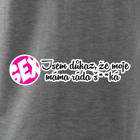 Vtipné triko s nápisem "Jsem důkaz toho, že moje máma ráda šuká". Triko pro vtipálka.