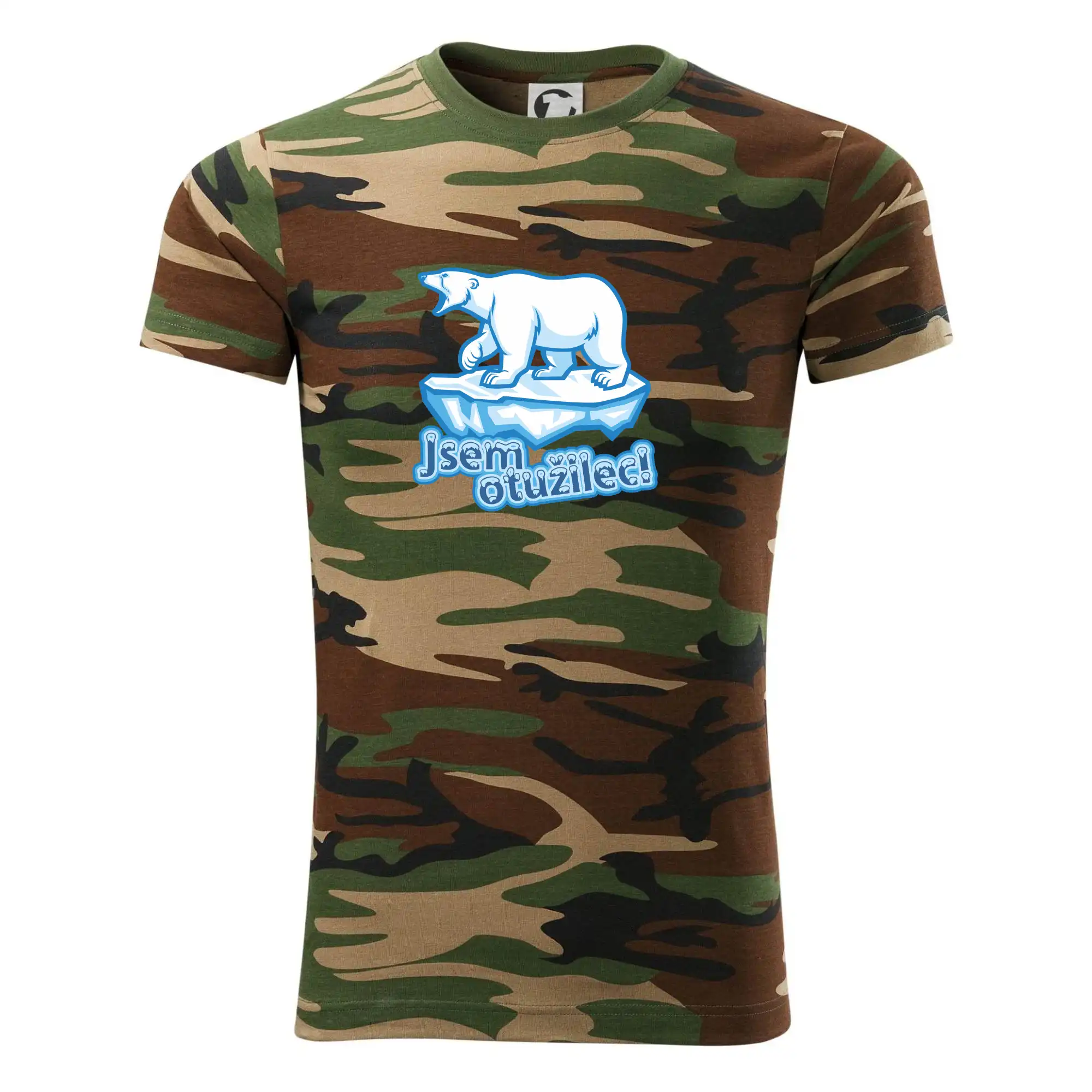 Tričko střední gramáže v barvách camouflage. Střih s bočními švy. Lem průkrčníku ze žebrového úpletu s přídavkem 5 % elastanu. Vnitřní část zadního průkrčníku začištěna páskou v barvě camouflage.