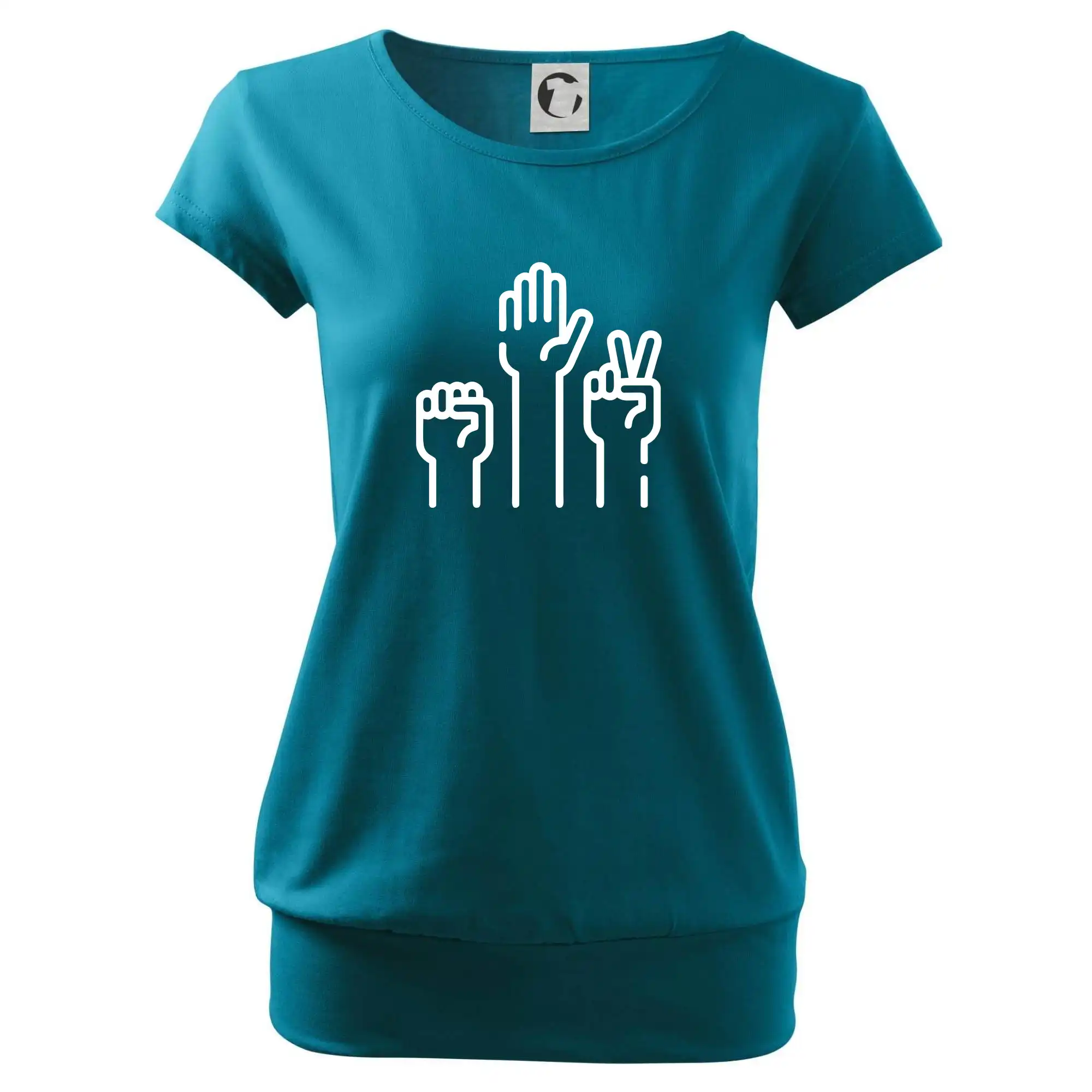 Trendové dámské triko s velmi krátkým rukávem, volnějšího střihu, v dolním kraji všité do širokého lemu. Kulatý průkrčník s úzkým lemem ze shodného materiálu.