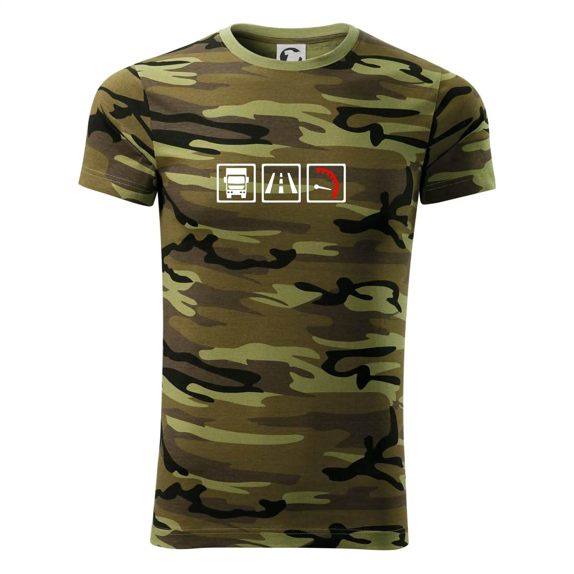 Tričko střední gramáže v barvách camouflage. Střih s bočními švy. Lem průkrčníku ze žebrového úpletu s přídavkem 5 % elastanu. Vnitřní část zadního průkrčníku začištěna páskou v barvě camouflage.