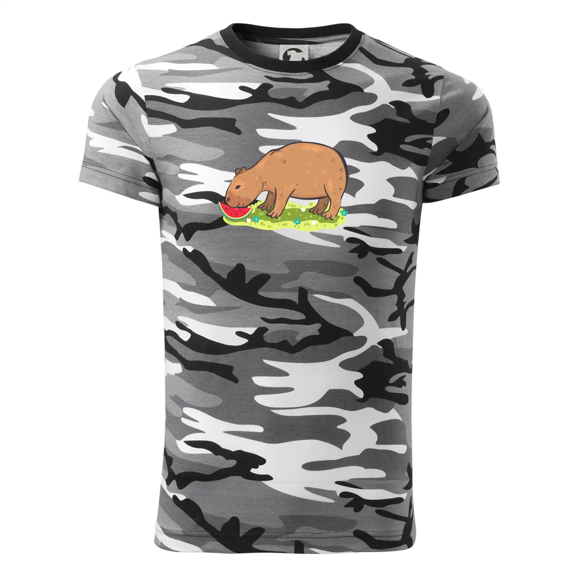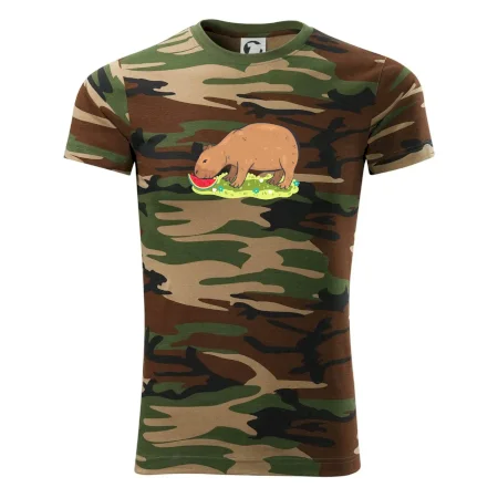 Tričko střední gramáže v barvách camouflage. Střih s bočními švy. Lem průkrčníku ze žebrového úpletu s přídavkem 5 % elastanu. Vnitřní část zadního průkrčníku začištěna páskou v barvě camouflage.