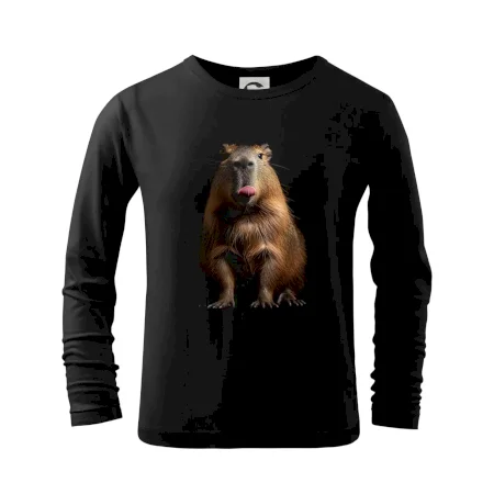 Kapybara s vypláznutým jazykem černá fotka