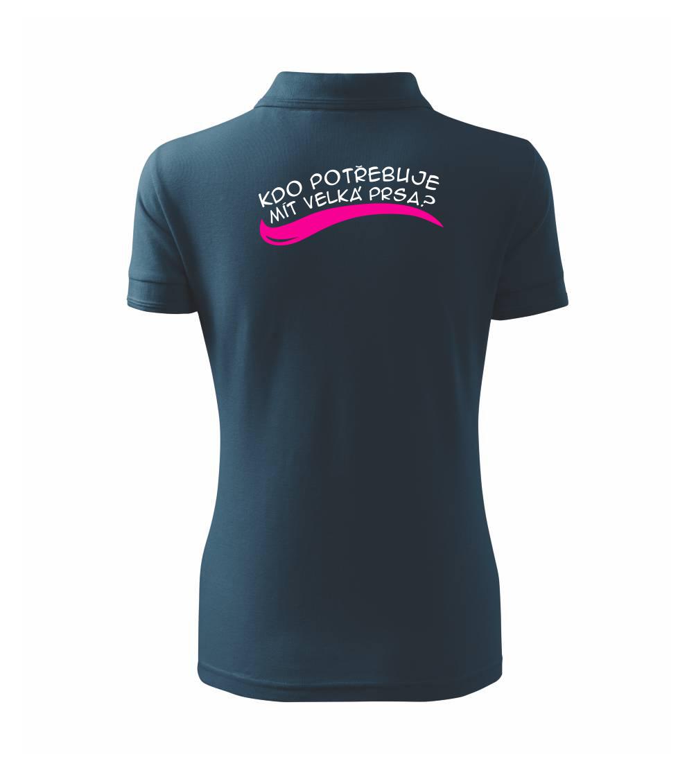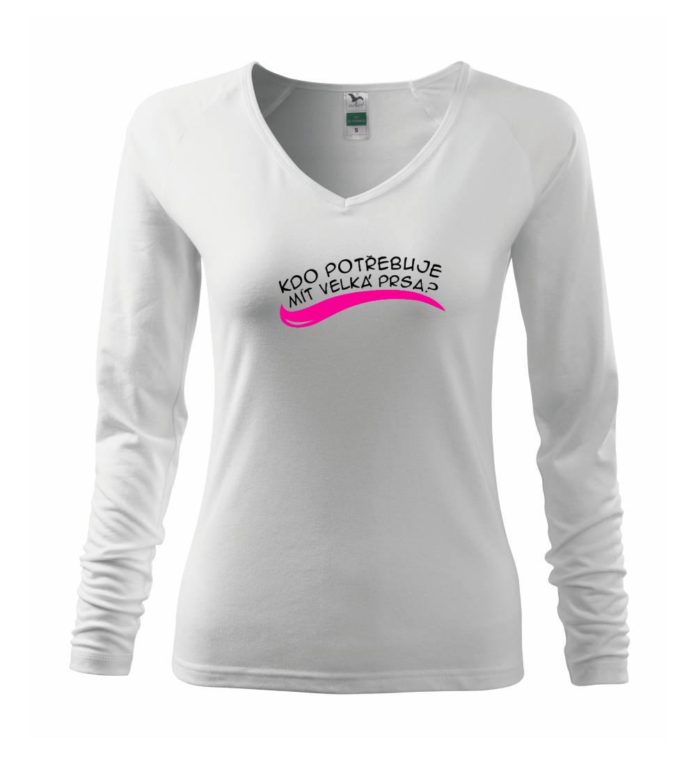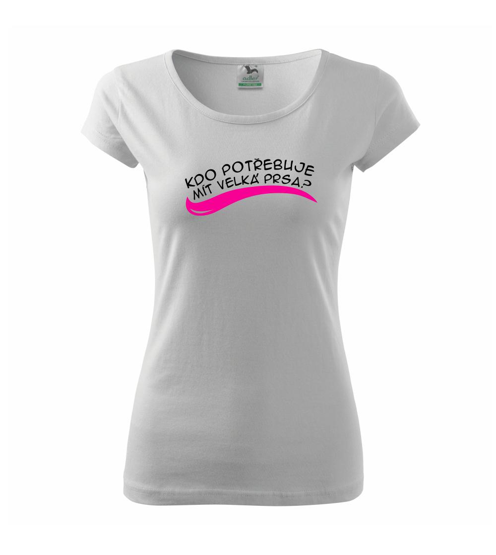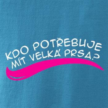 Vtipné triko pro holku, která má malá prsa a smysl pro humor. Na přední straně trička je nápis "Kdo potřebuje mít velká prsa?", vzadu je "Stačí zadek jako tenhle!". Vtipný dárek pro holku s pěkným zadkem.