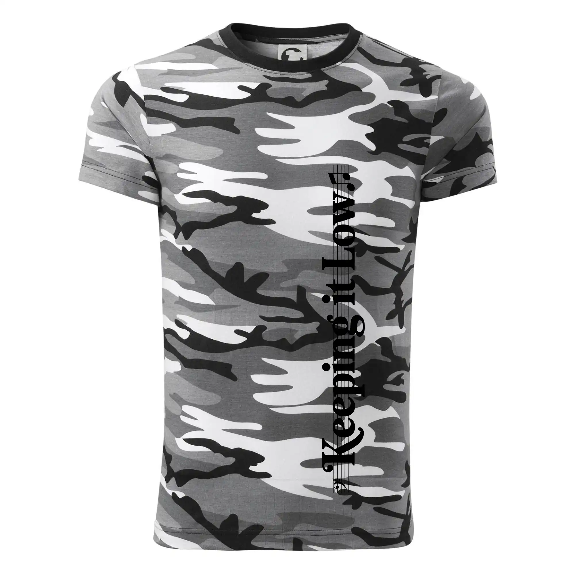 Tričko střední gramáže v barvách camouflage. Střih s bočními švy. Lem průkrčníku ze žebrového úpletu s přídavkem 5 % elastanu. Vnitřní část zadního průkrčníku začištěna páskou v barvě camouflage.