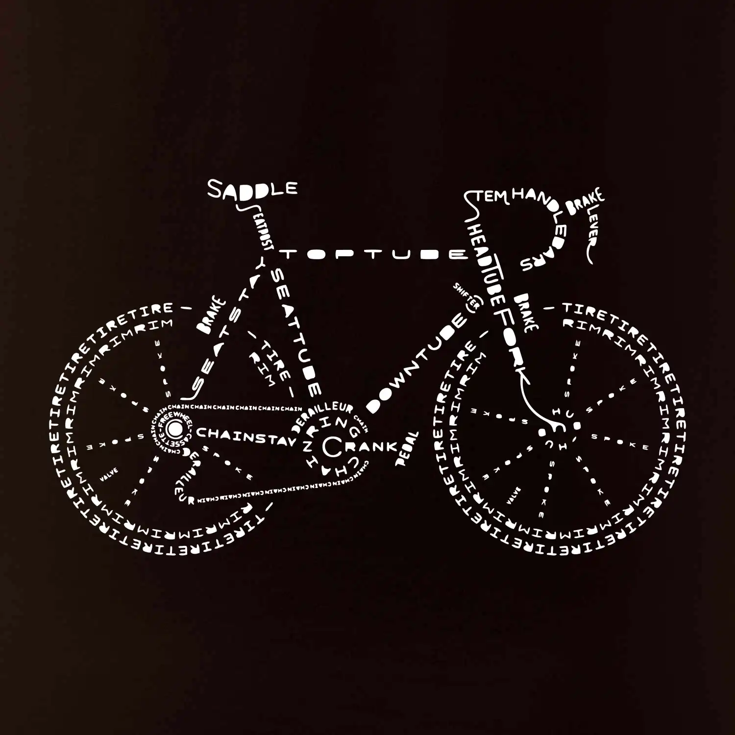 Jezdíš rád na kole? Pak se ti určitě bude líbit tohle cyklistické tričko. Sedlo, řidítka, šlapka, ... kolo na tričku je poskládáno z názvů jednotlivých dílů kola. Triko pro cyklistu potěší každého, kdo rád jezdí na kole. Dárek pro cyklistu.
