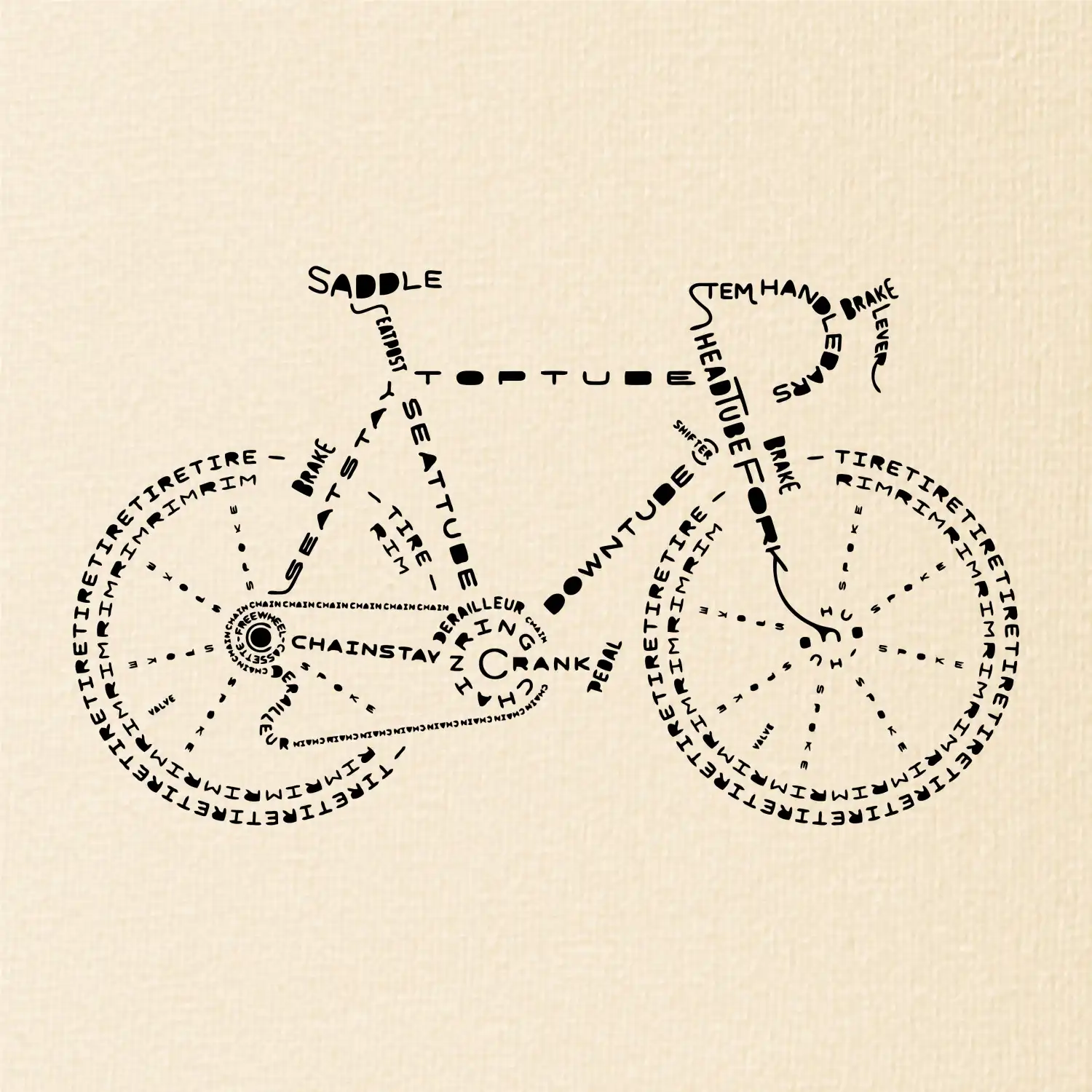Jezdíš rád na kole? Pak se ti určitě bude líbit tohle cyklistické tričko. Sedlo, řidítka, šlapka, ... kolo na tričku je poskládáno z názvů jednotlivých dílů kola. Triko pro cyklistu potěší každého, kdo rád jezdí na kole. Dárek pro cyklistu.