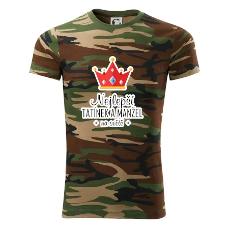 Tričko střední gramáže v barvách camouflage. Střih s bočními švy. Lem průkrčníku ze žebrového úpletu s přídavkem 5 % elastanu. Vnitřní část zadního průkrčníku začištěna páskou v barvě camouflage.