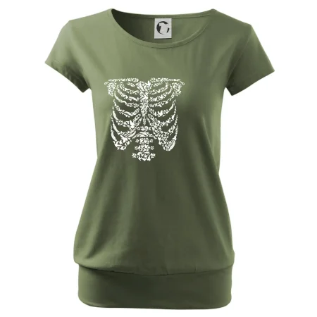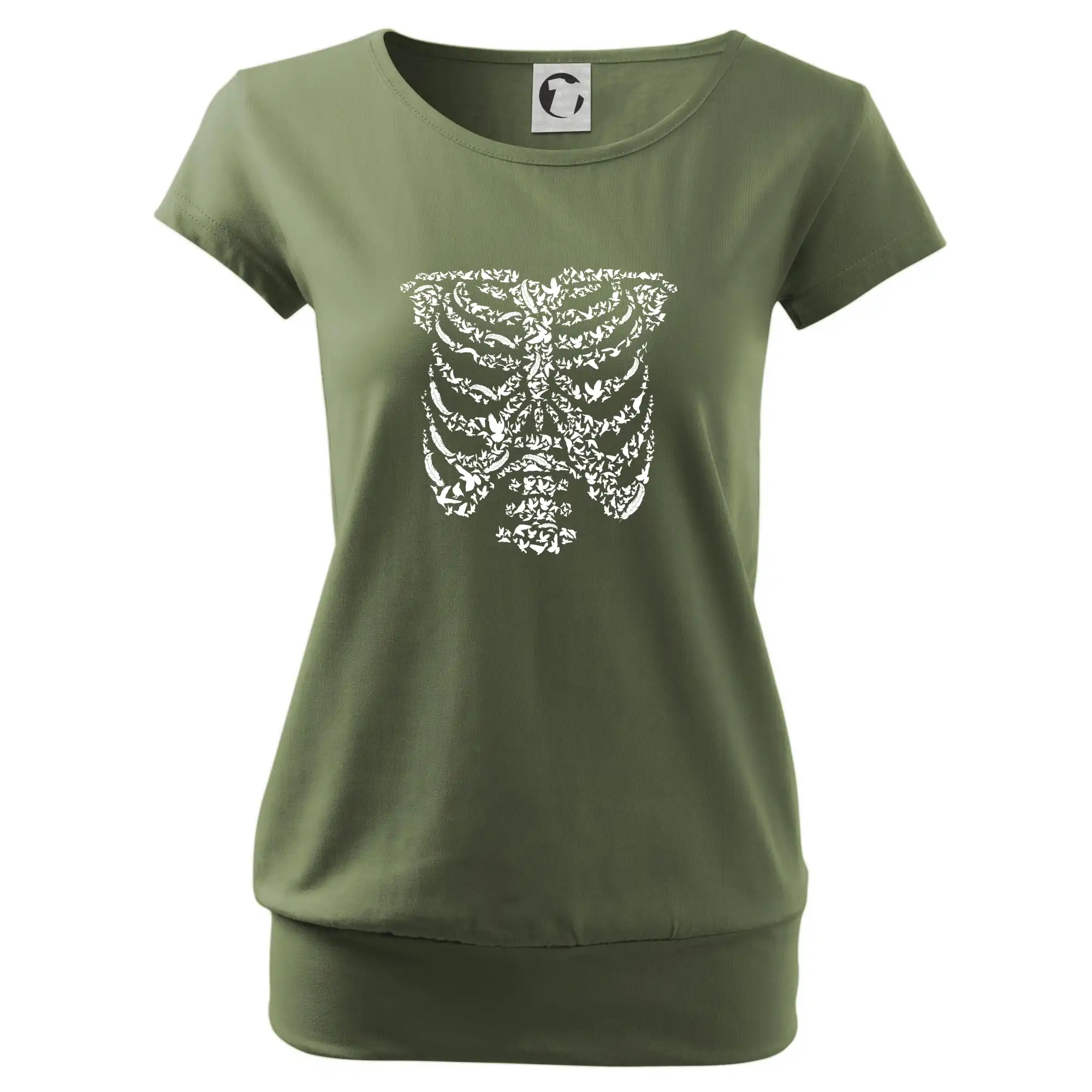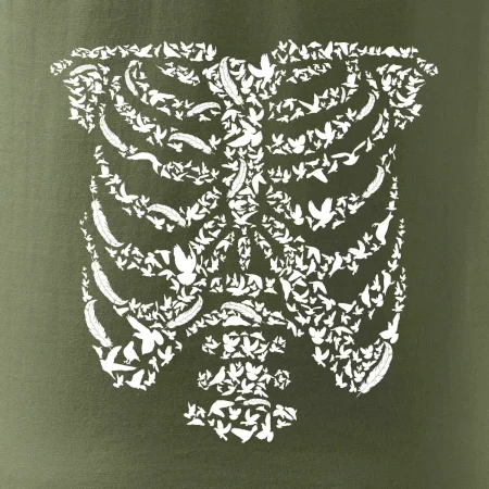 Umělecká kombinace ptáčků a kostry na triku.