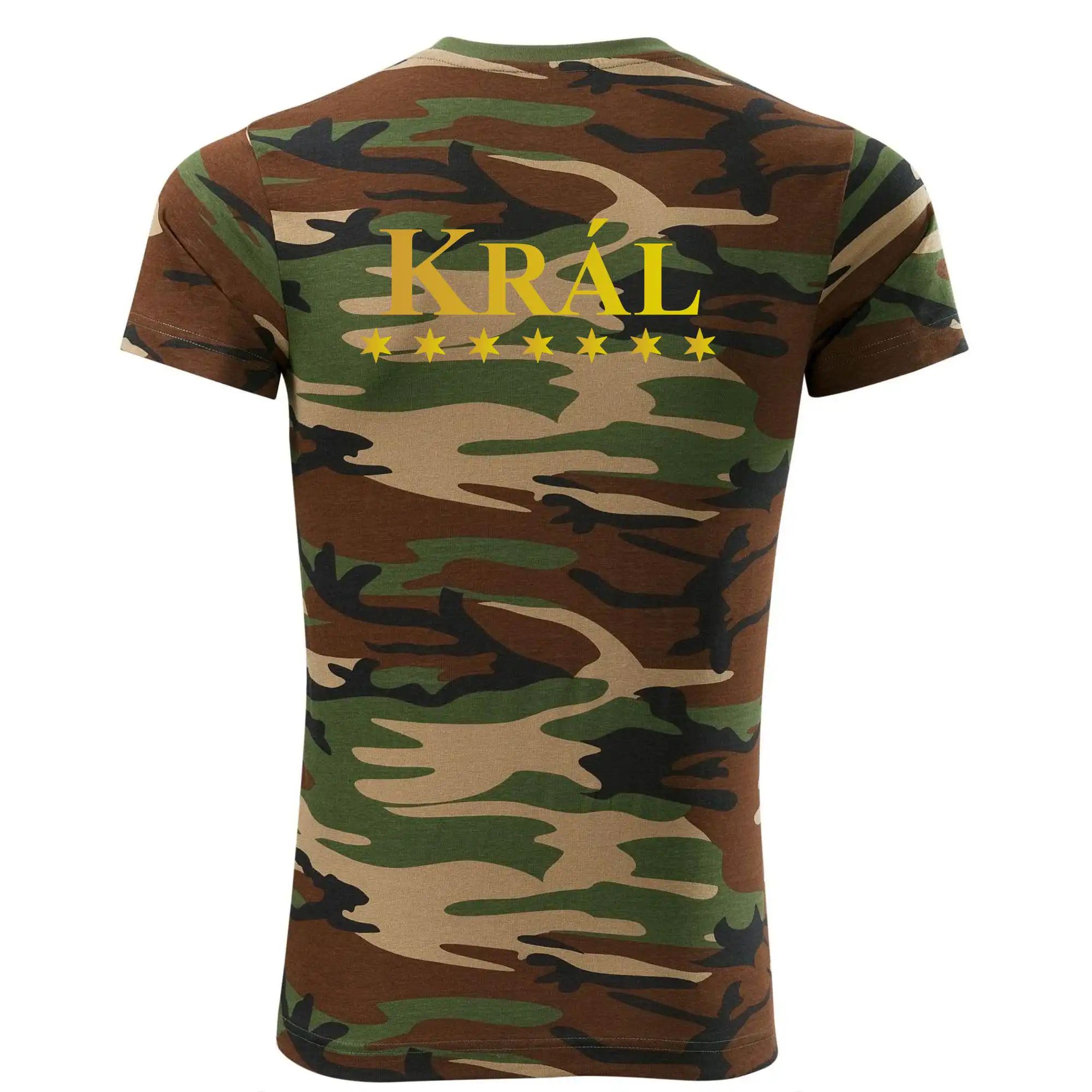 Tričko střední gramáže v barvách camouflage. Střih s bočními švy. Lem průkrčníku ze žebrového úpletu s přídavkem 5 % elastanu. Vnitřní část zadního průkrčníku začištěna páskou v barvě camouflage.