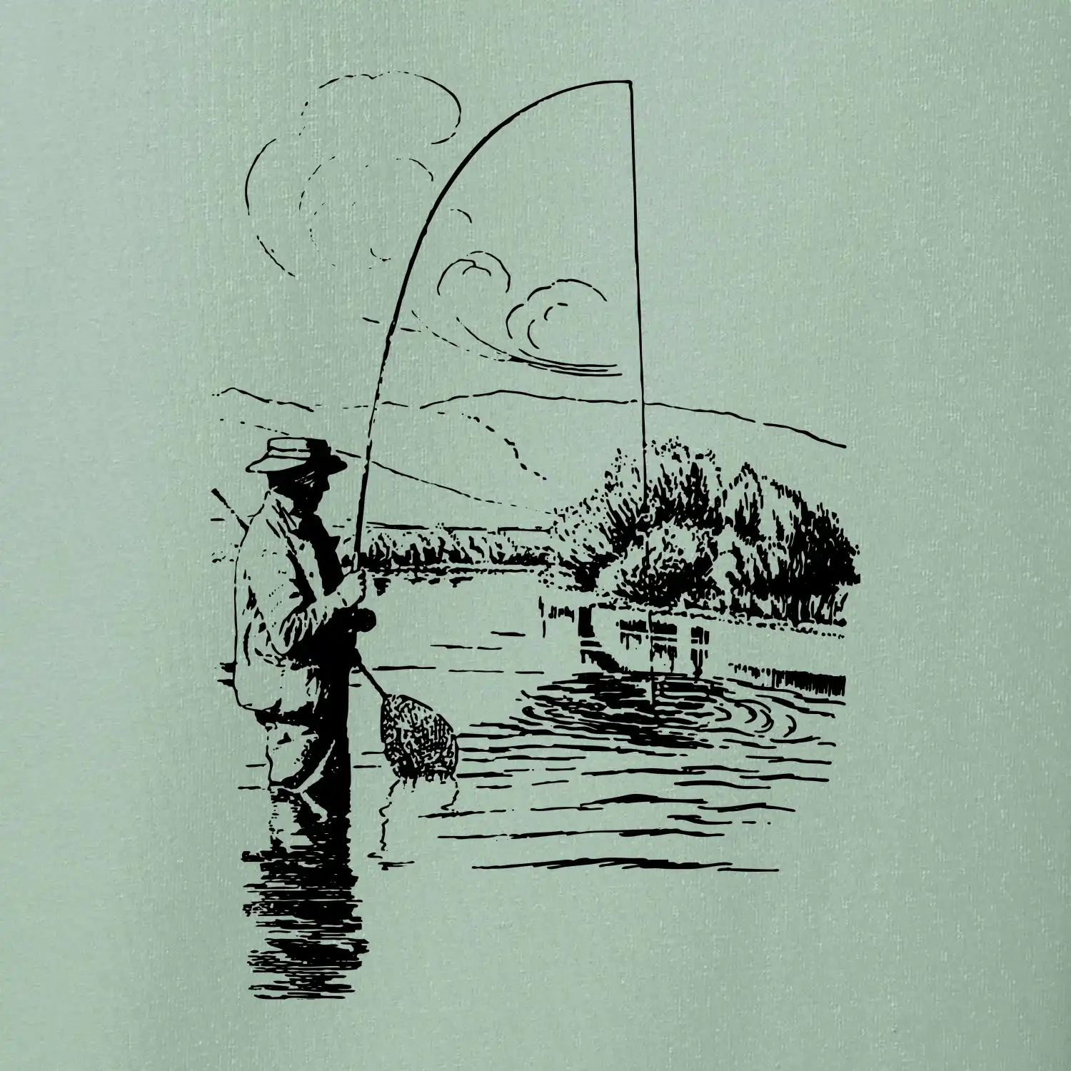Kreslený rybář s podběrákem