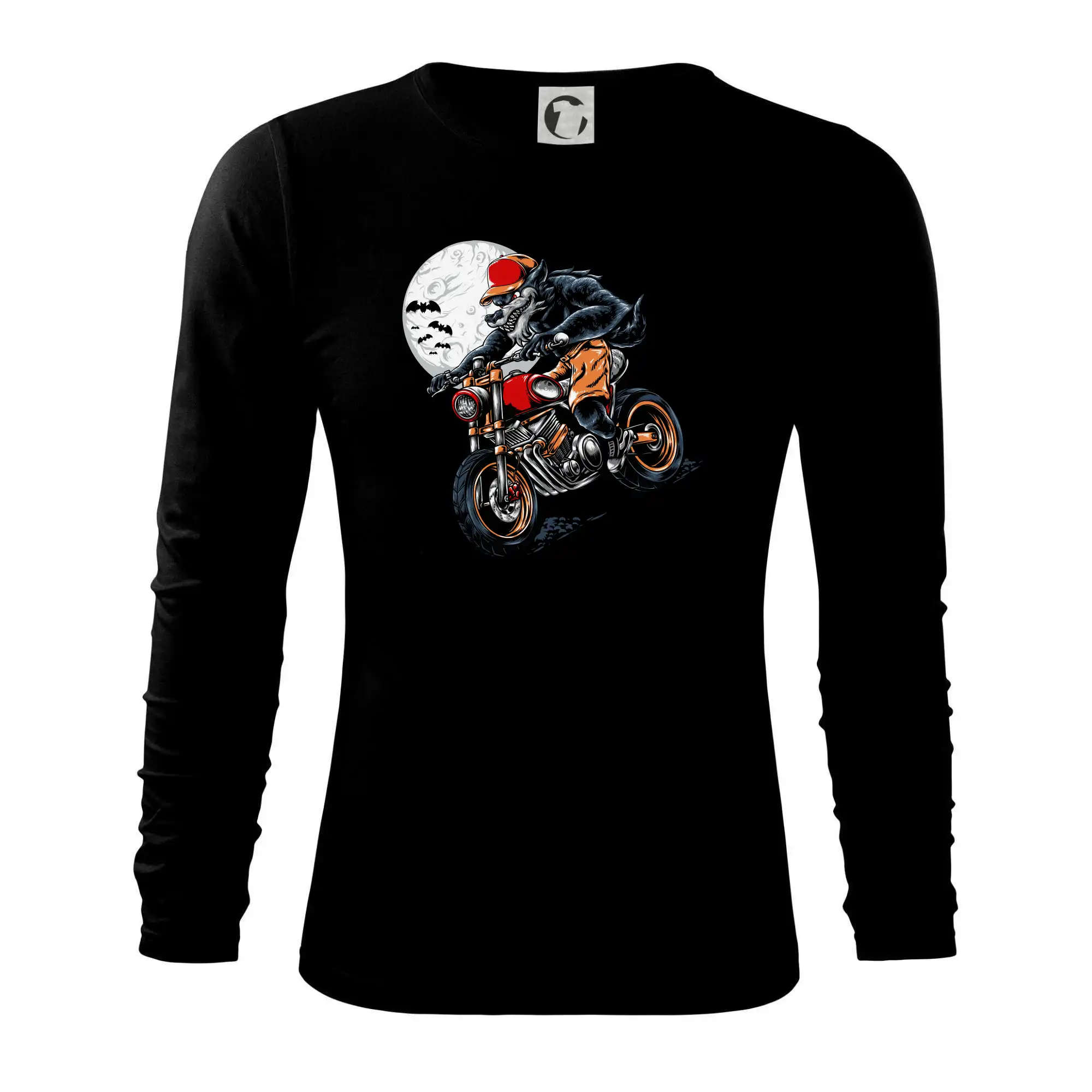 Kreslený vlk na motorce