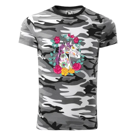 Tričko střední gramáže v barvách camouflage. Střih s bočními švy. Lem průkrčníku ze žebrového úpletu s přídavkem 5 % elastanu. Vnitřní část zadního průkrčníku začištěna páskou v barvě camouflage.