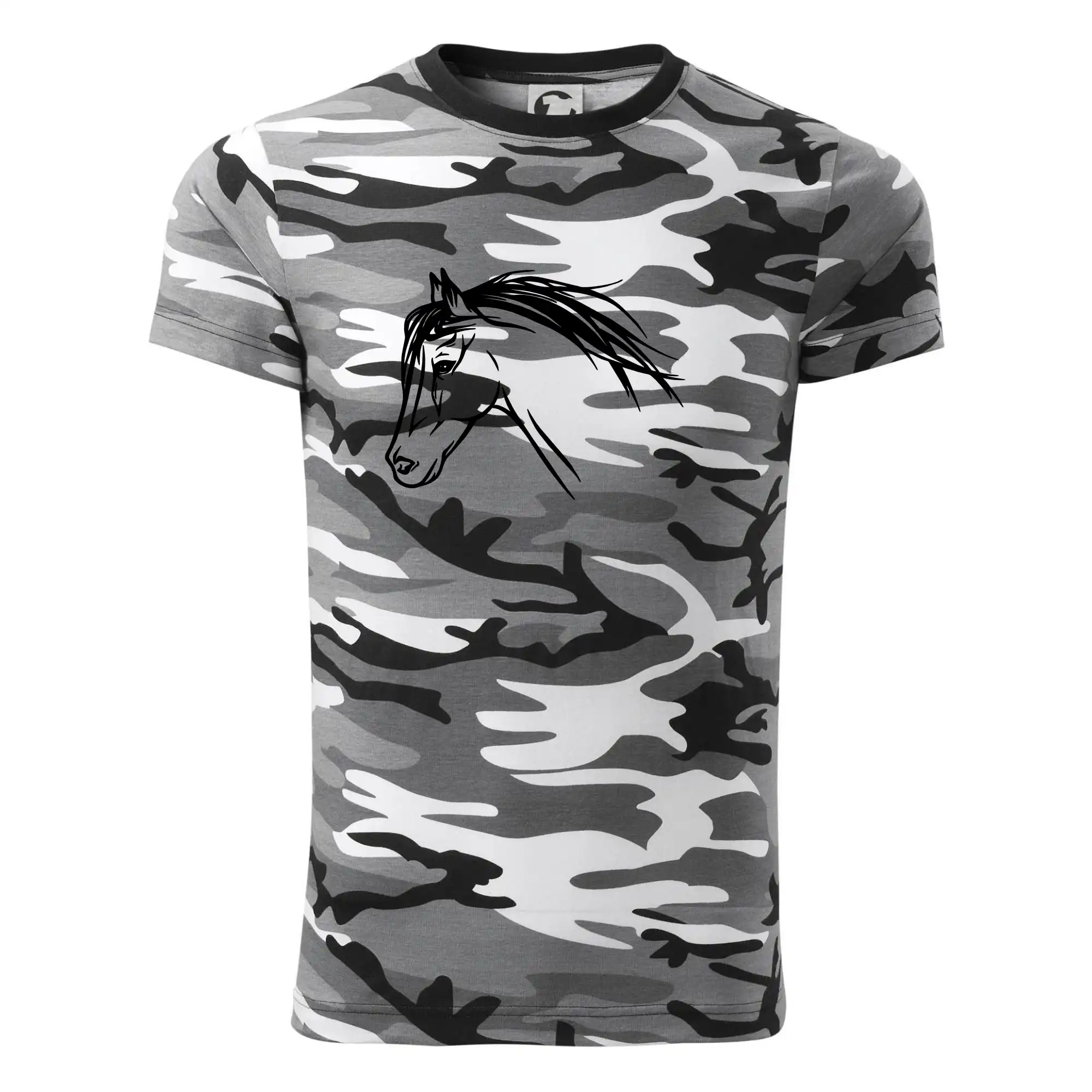 Tričko střední gramáže v barvách camouflage. Střih s bočními švy. Lem průkrčníku ze žebrového úpletu s přídavkem 5 % elastanu. Vnitřní část zadního průkrčníku začištěna páskou v barvě camouflage.