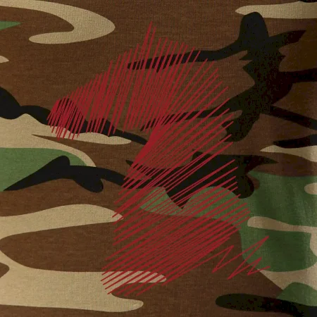 Tričko střední gramáže v barvách camouflage. Střih s bočními švy. Lem průkrčníku ze žebrového úpletu s přídavkem 5 % elastanu. Vnitřní část zadního průkrčníku začištěna páskou v barvě camouflage.
