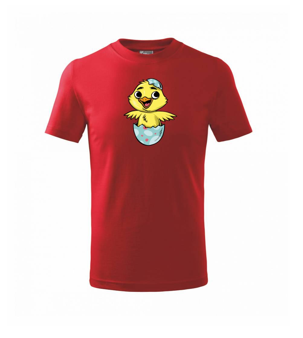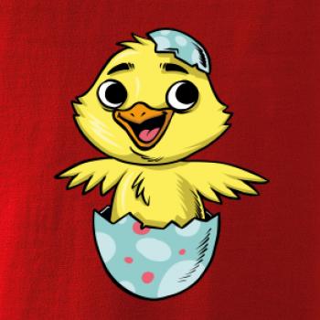 Dětské body, na kterém je zvíře - kuřátko, které se líhne z vajíčka, vykouzlí na dětské tváři úsměv. Triko s kuřátkem je vhodný dárek pro dítě, které má rádo zvířata. Kuře má na hlavě skořápku od vajíčka.