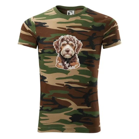 Tričko střední gramáže v barvách camouflage. Střih s bočními švy. Lem průkrčníku ze žebrového úpletu s přídavkem 5 % elastanu. Vnitřní část zadního průkrčníku začištěna páskou v barvě camouflage.