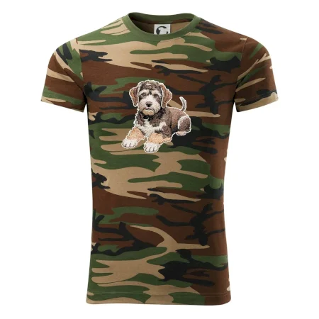 Tričko střední gramáže v barvách camouflage. Střih s bočními švy. Lem průkrčníku ze žebrového úpletu s přídavkem 5 % elastanu. Vnitřní část zadního průkrčníku začištěna páskou v barvě camouflage.