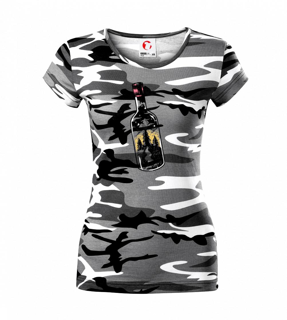 Láhev ve které je celý svět. Triko s lahví, ve které je les a hory je vhodný dárek pro cestovatele. Každý kdo má rád cestování a turistika je jeho oblíbená činnost, by si měl tohle triko pořídit. Triko pro kempaře by si měl pořídit každý správný lesák.