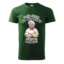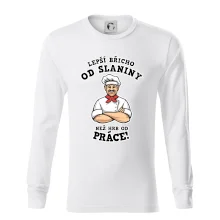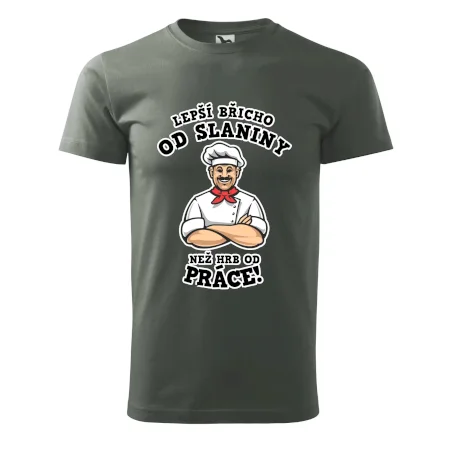 Dobře se najíst je základ, pak i ta práce jde dobře od ruky. Triko pro kuchaře, na kterém kuchař a nápis "Lepší triko od slaniny, než hrb od práce!", je vhodný dárek pro kuchaře. Kuchařské triko potěší každého kuchaře, který miluje vaření.