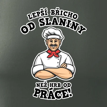 Dobře se najíst je základ, pak i ta práce jde dobře od ruky. Triko pro kuchaře, na kterém kuchař a nápis "Lepší triko od slaniny, než hrb od práce!", je vhodný dárek pro kuchaře. Kuchařské triko potěší každého kuchaře, který miluje vaření.