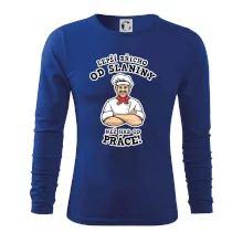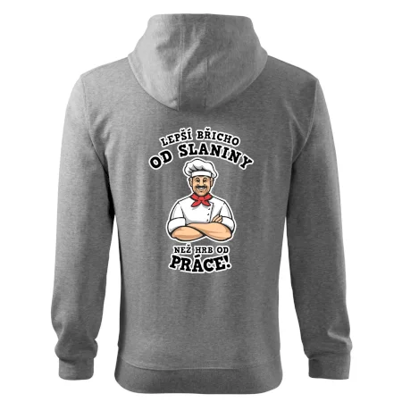 Dobře se najíst je základ, pak i ta práce jde dobře od ruky. Triko pro kuchaře, na kterém kuchař a nápis "Lepší triko od slaniny, než hrb od práce!", je vhodný dárek pro kuchaře. Kuchařské triko potěší každého kuchaře, který miluje vaření.