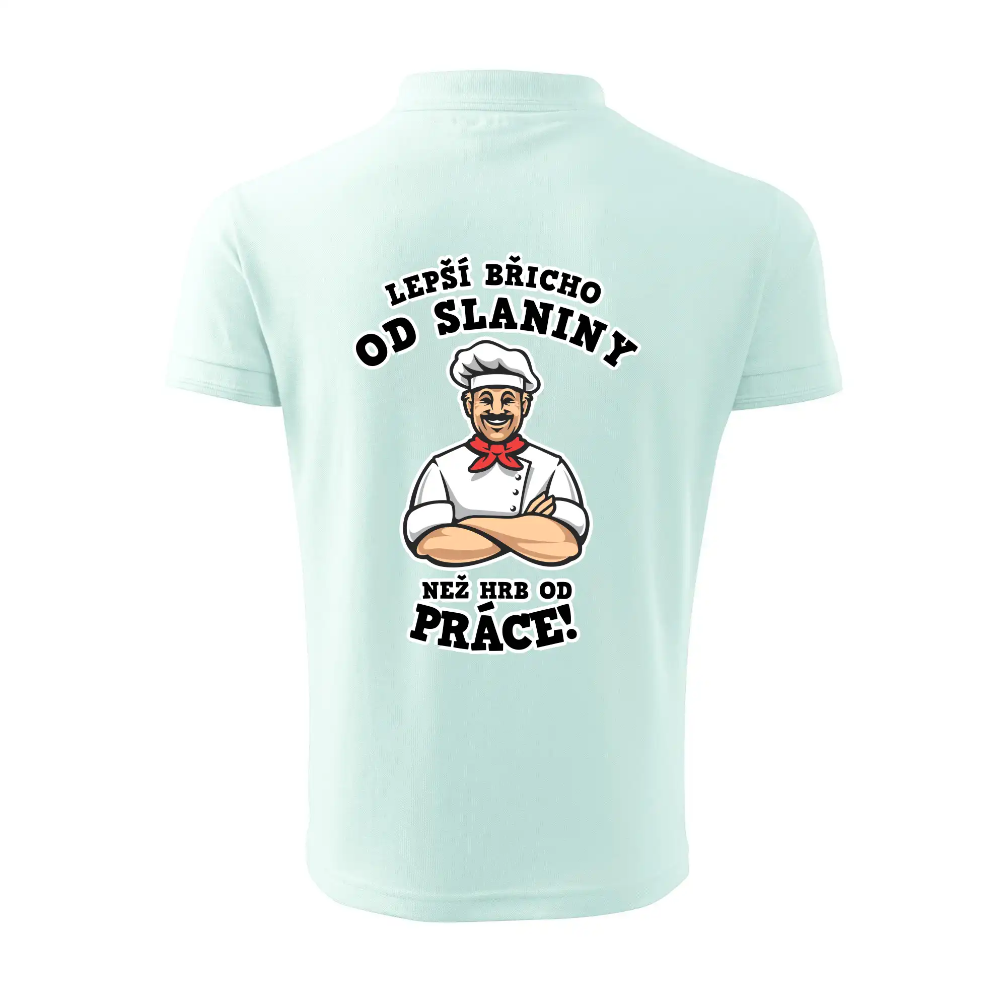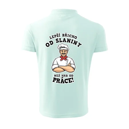 Dobře se najíst je základ, pak i ta práce jde dobře od ruky. Triko pro kuchaře, na kterém kuchař a nápis "Lepší triko od slaniny, než hrb od práce!", je vhodný dárek pro kuchaře. Kuchařské triko potěší každého kuchaře, který miluje vaření.