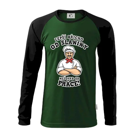 Dobře se najíst je základ, pak i ta práce jde dobře od ruky. Triko pro kuchaře, na kterém kuchař a nápis "Lepší triko od slaniny, než hrb od práce!", je vhodný dárek pro kuchaře. Kuchařské triko potěší každého kuchaře, který miluje vaření.