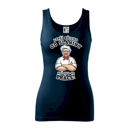Dobře se najíst je základ, pak i ta práce jde dobře od ruky. Triko pro kuchaře, na kterém kuchař a nápis "Lepší triko od slaniny, než hrb od práce!", je vhodný dárek pro kuchaře. Kuchařské triko potěší každého kuchaře, který miluje vaření.