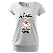 Dobře se najíst je základ, pak i ta práce jde dobře od ruky. Triko pro kuchaře, na kterém kuchař a nápis "Lepší triko od slaniny, než hrb od práce!", je vhodný dárek pro kuchaře. Kuchařské triko potěší každého kuchaře, který miluje vaření.