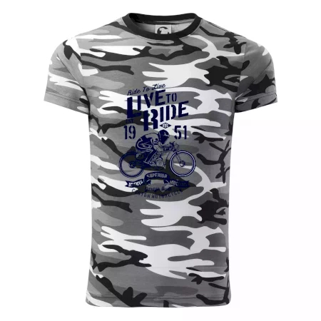 Tričko střední gramáže v barvách camouflage. Střih s bočními švy. Lem průkrčníku ze žebrového úpletu s přídavkem 5 % elastanu. Vnitřní část zadního průkrčníku začištěna páskou v barvě camouflage.