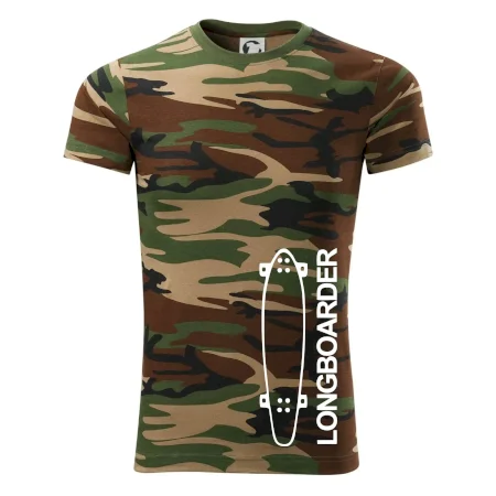 Tričko střední gramáže v barvách camouflage. Střih s bočními švy. Lem průkrčníku ze žebrového úpletu s přídavkem 5 % elastanu. Vnitřní část zadního průkrčníku začištěna páskou v barvě camouflage.