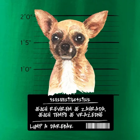 Triko pro pejskaře s nápisem "Jejich revírem je zahrada, jejich tempo je vražedné, lump a darebák". Triko, na kterém je pes čivava, by měl doma mít každý správný pejskař. Triko se psem je vhodný dárek pro pejskaře.