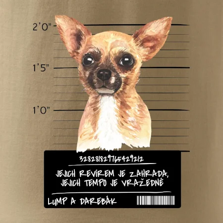 Triko pro pejskaře s nápisem "Jejich revírem je zahrada, jejich tempo je vražedné, lump a darebák". Triko, na kterém je pes čivava, by měl doma mít každý správný pejskař. Triko se psem je vhodný dárek pro pejskaře.