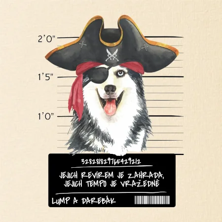 Triko pro pejskaře s nápisem "Jejich revírem je zahrada, jejich tempo je vražedné, lump a darebák". Triko, na kterém je pirát pes husky, by měl doma mít každý správný pejskař. Triko se psem je vhodný dárek pro pejskaře.