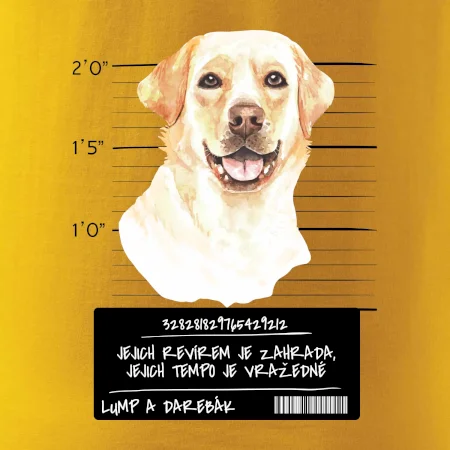 Triko pro pejskaře s nápisem "Jejich revírem je zahrada, jejich tempo je vražedné, lump a darebák". Triko, na kterém je pes labrador, by měl doma mít každý správný pejskař. Triko se psem, na kterém je labradorský retrívr, je vhodný dárek pro pejskaře.