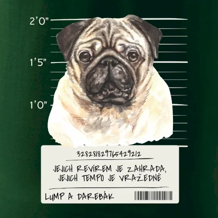 Triko pro pejskaře s nápisem "Jejich revírem je zahrada, jejich tempo je vražedné, lump a darebák". Triko, na kterém je pes mops, by měl doma mít každý správný pejskař. Triko se psem je vhodný dárek pro pejskaře.