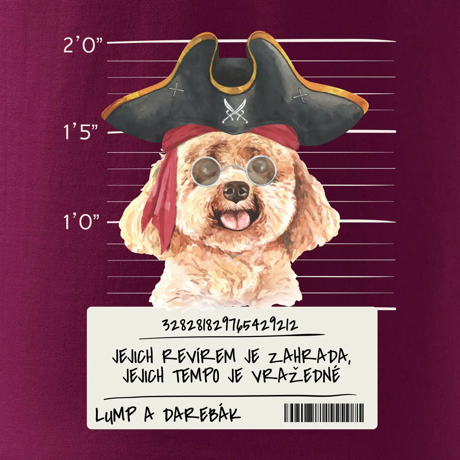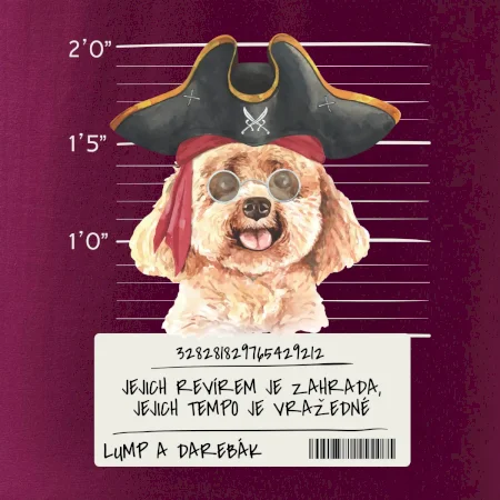 Triko pro pejskaře s nápisem "Jejich revírem je zahrada, jejich tempo je vražedné, lump a darebák". Triko, na kterém je pirát pes pudl, by měl doma mít každý správný pejskař. Triko se psem je vhodný dárek pro pejskaře.